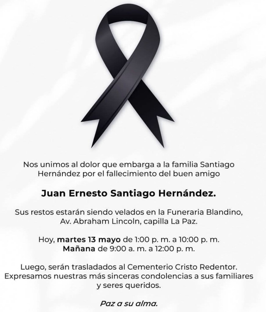 Juan Ernesto Santiago un Joven que deja huellas inolvidables en nuestros corazones de una gran generación de la Juventud; Un gran ser Humano; nos Unimos al dolor y la pena que pasa todas su familia,amigos y dirigente politico,Nuestro más sentidos pésame «QUE DIOS LO TENGA SU SANTA GLORIA»