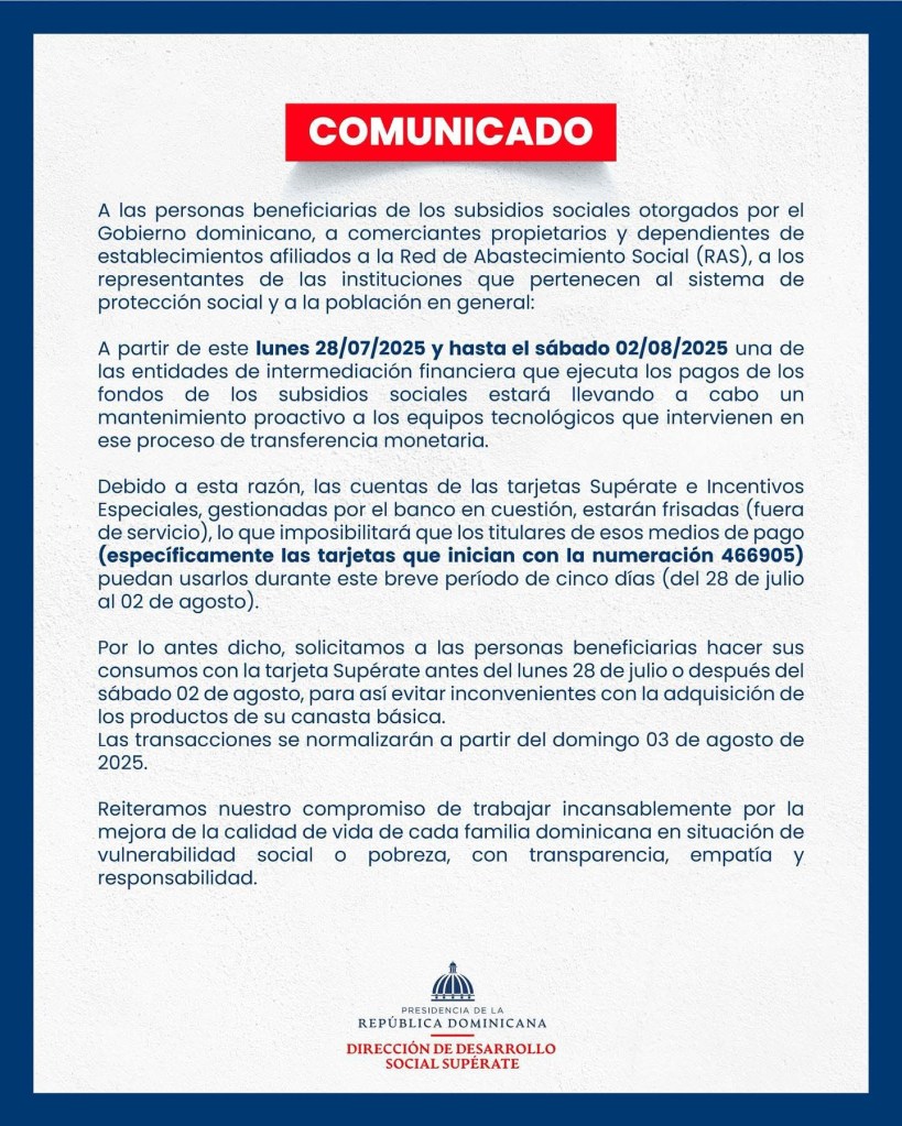 República Dominicana–(Santo Domingo)- COMUNICADO | Informamos a los beneficiarios y beneficiarias que desde el lunes 28 de julio al sábado 2 de agosto de 2025, las tarjetas Supérate e Incentivos Especiales (que inician con 466905) estarán temporalmente fuera de servicio por mantenimiento del banco.