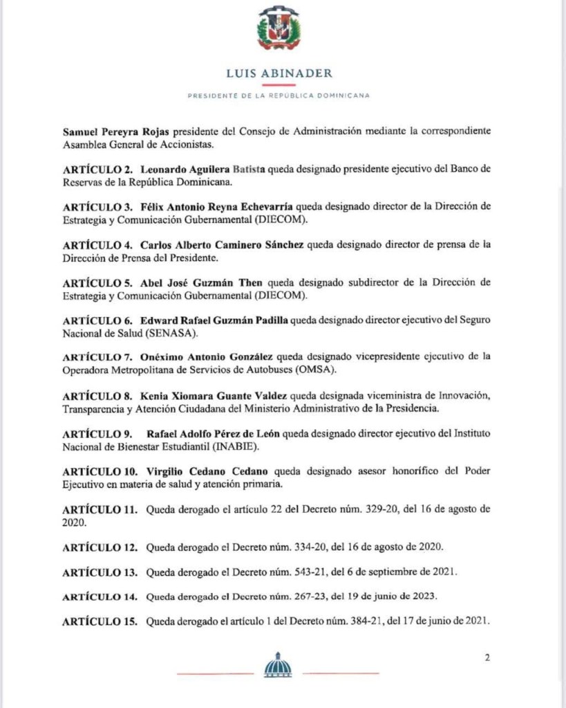 Asimismo, el decreto designa al doctor Leonardo Aguilera Batista como presidente ejecutivo del Banco de Reservas de la República Dominicana. Desde 2020 se desempeñaba como presidente ejecutivo de la Refinería Dominicana de Petróleo (REFIDOMSA). Aguilera es catedrático, asesor económico y consultor político, con más de tres décadas de trayectoria como presidente fundador del Centro Económico del Cibao (CEC). Ha sido consultor en República Dominicana, México, Haití y El Salvador, y miembro de la Asociación Latinoamericana de Consultores Políticos (ALACOP). Es autor de múltiples obras sobre economía y política, y posee estudios especializados en Economía y Política en la URSS y en la Universidad Autónoma de Santo Domingo.