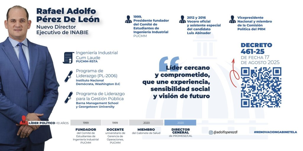 Como nuevo director ejecutivo del Instituto Nacional de Bienestar Estudiantil (INABIE) fue nombrado Rafael Adolfo Pérez de León, profesional vinculado al sector social, con experiencia en programas de asistencia y apoyo a comunidades educativas, así como en la gestión de programas de alimentación escolar y servicios estudiantiles.