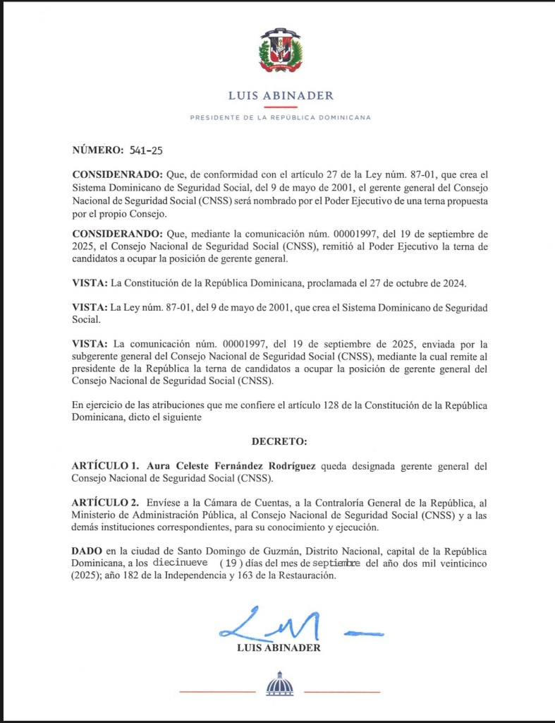República Dominicana-(Santo Domingo)- presidente Luis Abinader designó a la doctora Aura Celeste Fernández Rodríguez como Gerente General del Consejo Nacional de la Seguridad Social, CNSS, mediante el Decreto núm. 541-25, emitido en esta fecha.