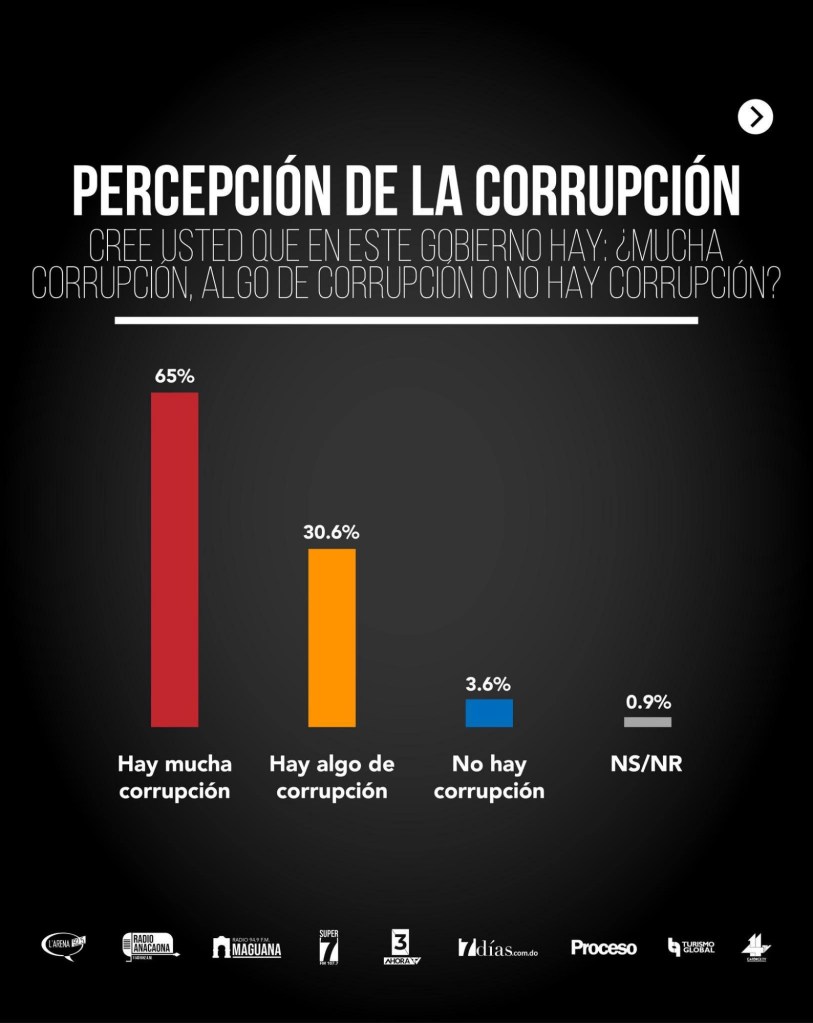 Republica Dominicana-(Santo Domingo)- La última encuesta nacional realizada por el Grupo ACD Media revela que un 65% de los dominicanos considera que en el gobierno actual existe “mucha corrupción”. Además, un 30.6% percibe que hay “algo de corrupción”, lo que significa que un 95.6% de la población cree que la corrupción es un problema tangible en esta administración. Solo un 3.6% aseguró no ver corrupción en el gobierno de Luis Abinader.