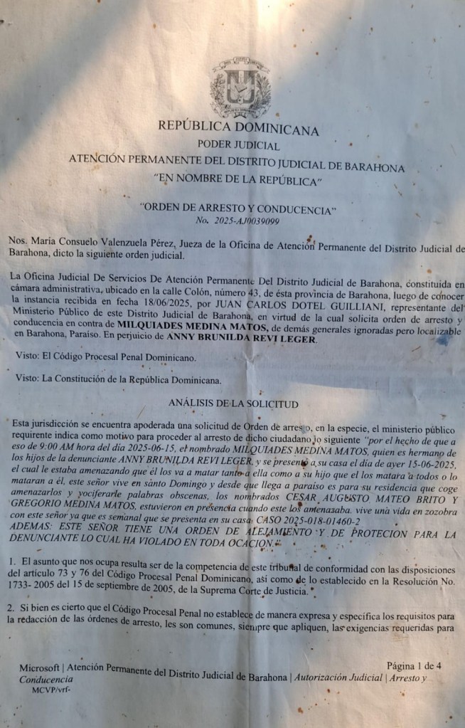 La ciudadana informó que contra el señor Medina Matos existe una orden de arresto y conducencia, emitida por la jueza María Consuelo Valenzuela Pérez, de la Oficina de Atención Permanente de Barahona, bajo el número 2025-AJ0039099.