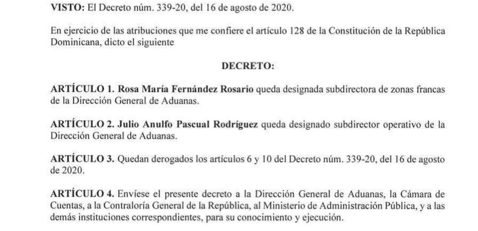 mediante el cual designó a Rosa María Fernández Rosario como subdirectora de zonas francas de la Dirección General de Aduanas (DGA)by a Julio Anulfo Pascual Rodríguez