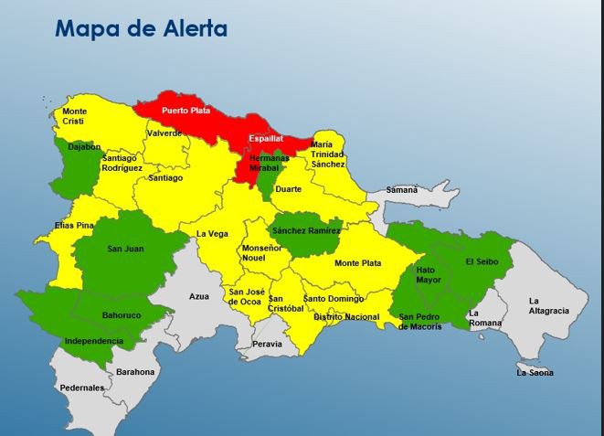 En alerta verde figuran Hato Mayor, Hermanas Mirabal, Dajabón, Independencia, Sánchez Ramírez, El Seibo, San Juan y Bahoruco.